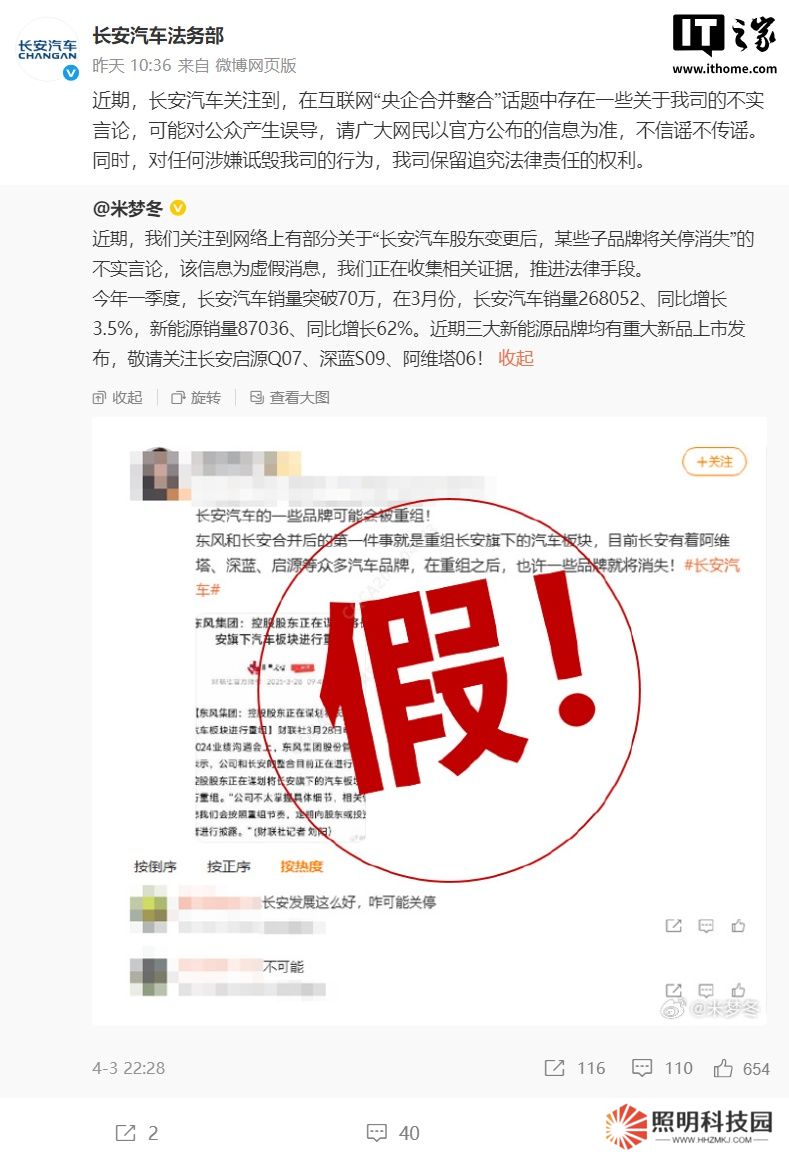 近期,長安汽車關(guān)注到,在互聯(lián)網(wǎng)“央企合并整合”話題中存在一些關(guān)于我司的不實(shí)言論,可能對公眾產(chǎn)生誤導(dǎo),請廣大網(wǎng)民以官方公布的信息為準(zhǔn),不信謠不傳謠。同時(shí),對任何涉嫌詆毀我司的行為,我司保留追究法律責(zé)任的權(quán)利。