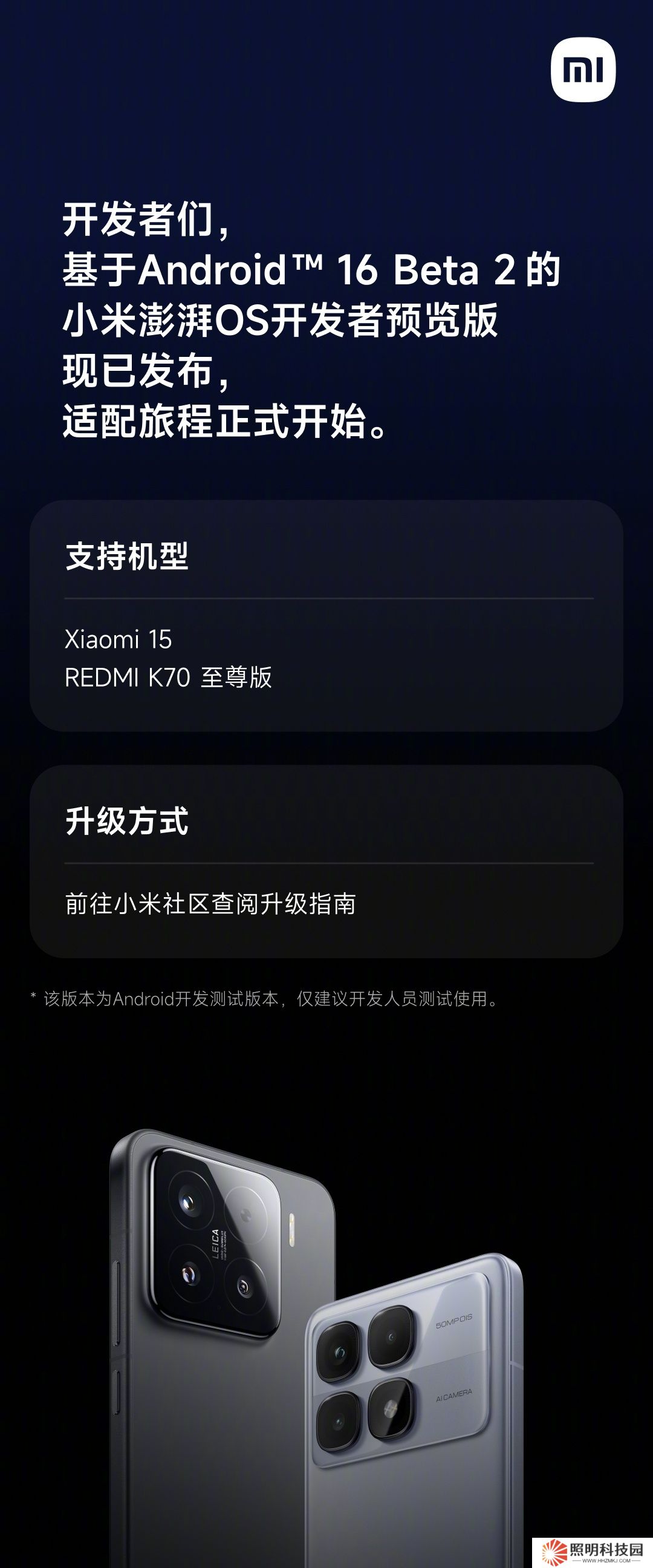 本站 4 月 8 日消息,小米澎湃OS發(fā)文,宣布基于安卓 16 Beta 2 的小米澎湃 OS 開發(fā)者預覽版現(xiàn)已發(fā)布,即日起,開發(fā)者們可使用小米 15、REDMI K70 至尊版嘗鮮適配。