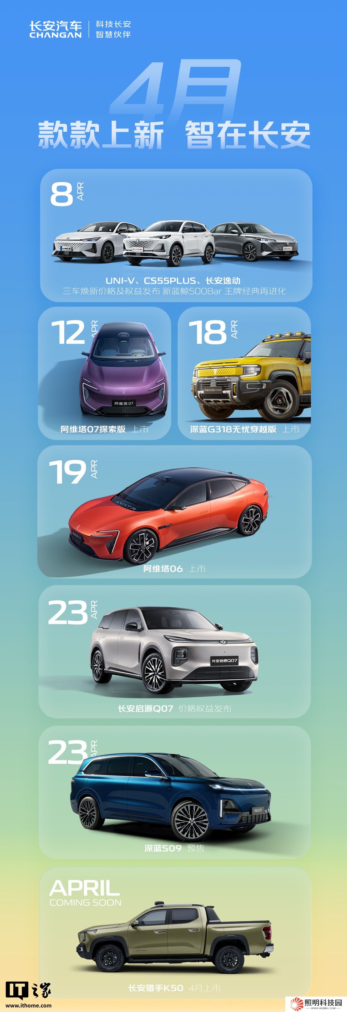 本站 4 月 8 日消息,長安汽車官方今日公布了 4 月新品計劃,含阿維塔 06 / 07 探索版、啟源 Q07 等 9 款車型。