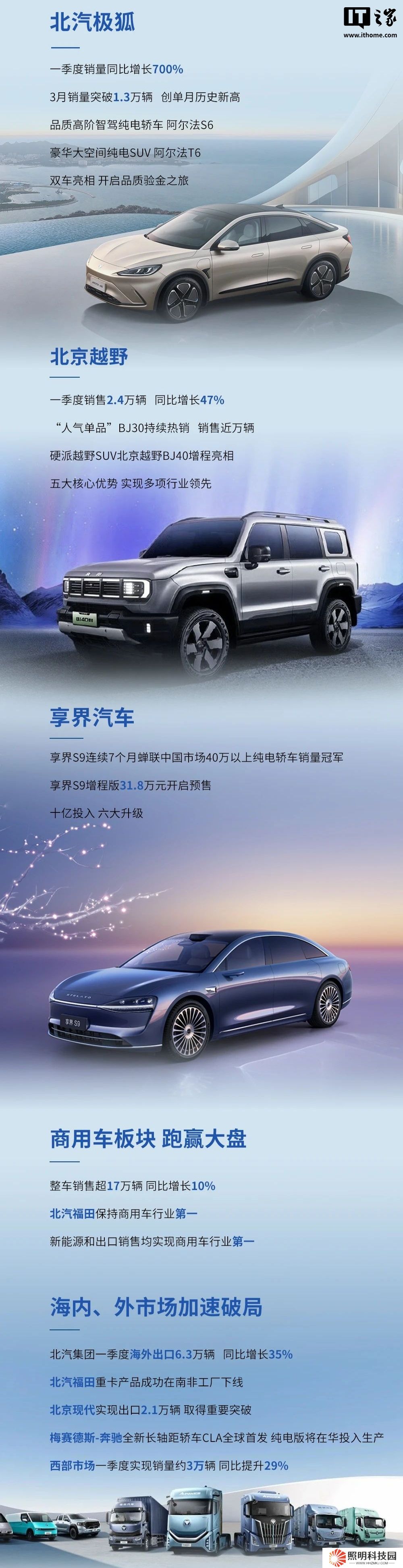 本站查詢獲悉,北汽極狐 3 月銷量超 1.3 萬輛,創單月歷史新高,同時一季度銷量同比增長 700%;北京越野一季度銷售 2.4 萬輛,同比增長 47%,其中 BJ30 車型銷售近萬輛;享界 S9 連續 7 個月蟬聯中國市場 40 萬以上純電轎車銷量冠軍;商用車板塊整車銷售超 17 萬輛,同比增長 10%,北汽福田保持商用車行業第一,新能源和出口銷售均實現商用車行業第一。