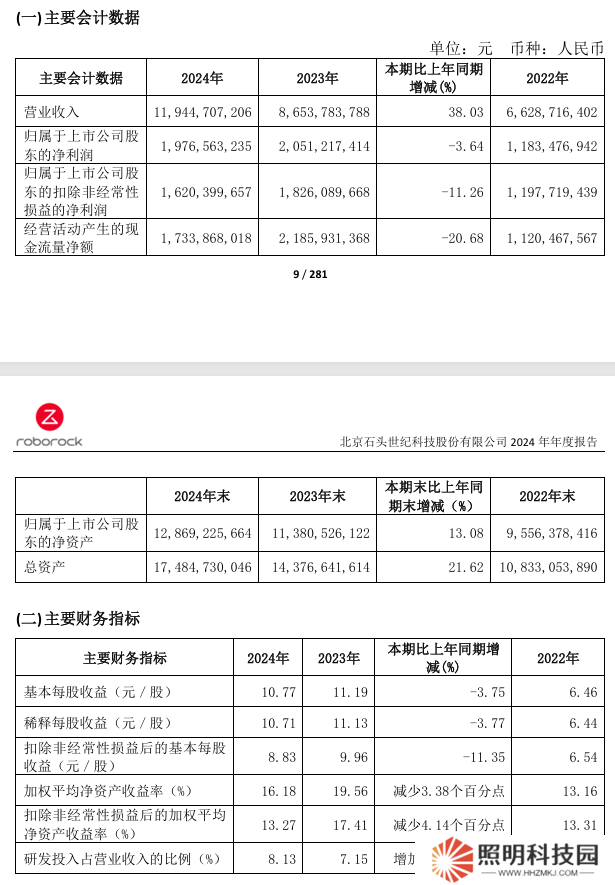 石頭科技 2024 年營收 119.45 億元同比增長 38.03%,凈利潤 19.77 億元
