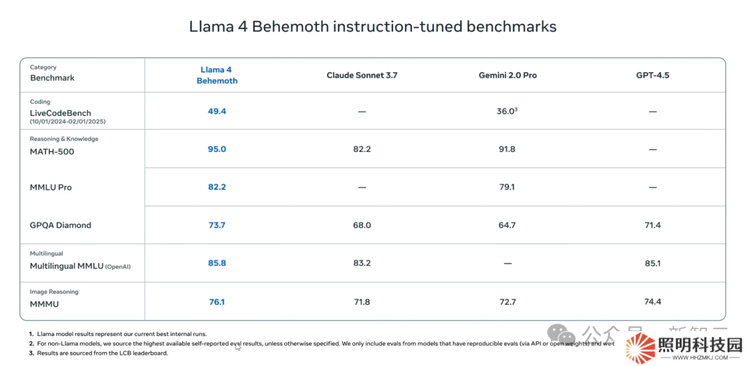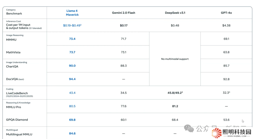 在下面這個表格中,Meta 將 Llama 4 和 Gemini2.0 Pro、GPT-4.5 等模型進行了比較,數字非常漂亮。