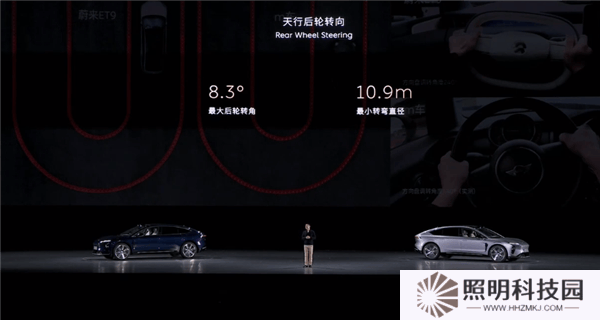 底盤系統是ET9的另一大亮點。它搭載了“SkyRide”天行底盤系統,擁有線控轉向、后輪轉向和全主動懸架等先進技術。其中,后輪轉向最大角度可達8.3°,最小轉彎直徑僅為10.9米,比寶馬MINI還要出色。ET9還配備了23英寸大輪轂和空氣懸架,擁有200mm離地間隙和220mm懸架行程,可在一秒內下調50mm,為駕駛者提供了卓越的操控性能。