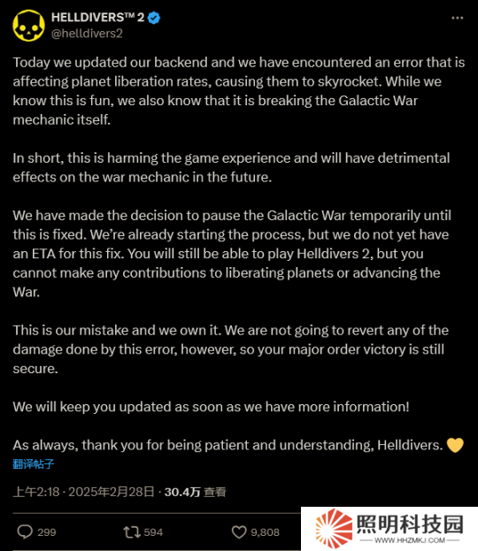 在熱門多人合作動作這集游戲《絕地潛兵2》的本周例行更新后,這款實(shí)時(shí)服務(wù)游戲的核心玩法,所有玩家共同推動進(jìn)度,保衛(wèi)星球的“銀河戰(zhàn)爭”出現(xiàn)了嚴(yán)重錯誤,導(dǎo)致玩家的星球解放速度飆升。