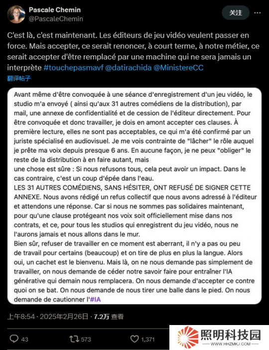 據翻譯,她在帖子中寫道:“公司給我(以及團隊的其他 31 名配音演員)發了一封電子郵件,其中包含發行商直接提供的保密和協議。我需要接受這些條款才能開始工作。當我躍度這些條款時我就已經知道,并且一位專業視聽行業的法律專家證實:這些條款是不可接受的。”
