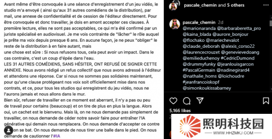 而她的同事顯然選擇了站在她這一邊,Chemin 繼續寫道:“其他 31 名配音演員毫不猶豫地拒絕了簽署這份協議。我們寫了一封集體拒絕信,發給了發行商,正在等待回復。如果我們現在不團結起來,將保護我們聲音地條款正式添加到我們的合同中——不只是我們,而是每個電子游戲配音工作室——我們將永遠得不到一個(公正的協議),我們將走向災難。”