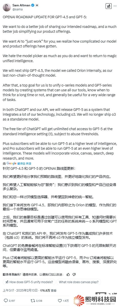 本站注意到,奧爾特曼今年 2 月曾發布一份路線圖,詳細闡述了公司 GPT-4.5 和 GPT-5 人工智能模型的發展計劃。