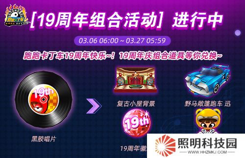使用“黑膠唱片”,參與3月6日 06:00至3月27日05:59期間開啟的<19周年組合活動>,將可兌換包括“野馬敞篷跑車 迅(無限制)”、“復古小屋背景(無限制)”、“復古頭飾(無限制)”、“19周年車牌(無限制)”、“19周年徽章(無限制)”等在內的19周年活動道具!