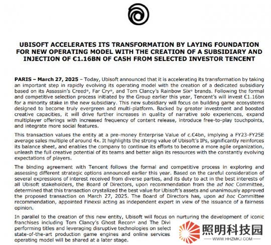 育碧在公告中宣布將成立子公司,《刺客信條》、《孤島驚魂》、《彩虹六號》這三大IP會納入新公司之中。該公司估值約40億歐元,其中騰訊投資11.6億歐元(約合人民幣90億元),持股25%。