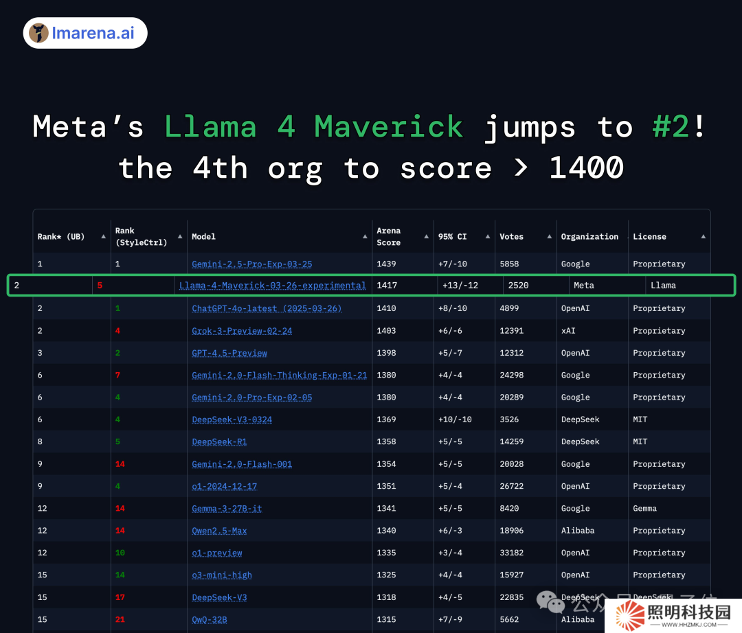 此次發布的 Llama 4 Maverick,在困難提示、編碼、數學、創意寫作方面并列第一;得分 1417,不僅大大超越了此前 Meta 自家的 Llama-3-405B(提升了 149 分),還成為史上第 4 個突破 1400 分的模型;。