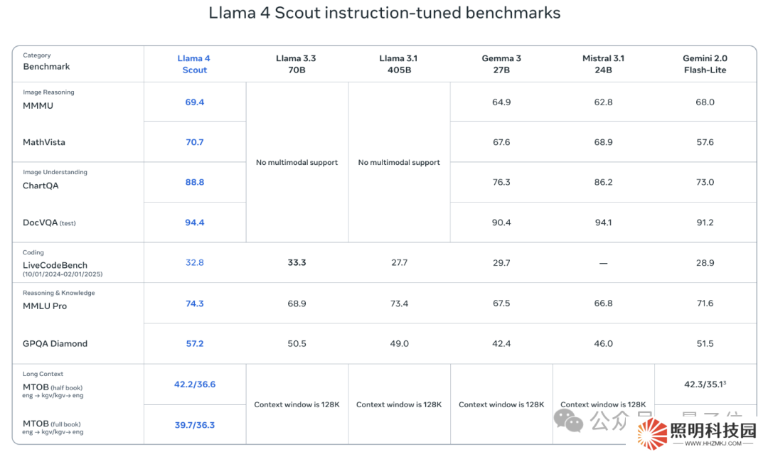 這一點主要體現在 Meta 公布的中杯 Llama 4 Scout 的詳細數據里:
