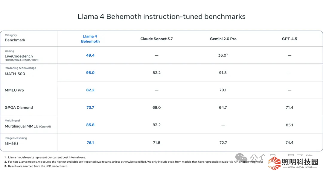 Llama 4 Behemoth:2 萬億參數的超大超強模型,以上二者都由這個模型蒸餾而來;目前還在訓練中;多個基準測試超過 GPT-4.5、Claude Sonnet 3.7 和 Gemini 2.0 Pro。