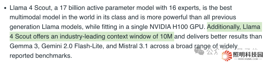 Llama 4 Scout,16 位專家的 170 億激活參數的多模態模型,單個 H100 GPU 可運行,同類 SOTA,并擁有 10M 上下文窗口。