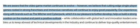 而根據CDPR公司最近的財報,這家曾打造了《巫師》系列和《賽博朋克2077》的波蘭游戲開發商表示,他們不會停止制作單人游戲,因為玩家對這類游戲的需求永遠不會消失,而且單人游戲依舊很受歡迎。