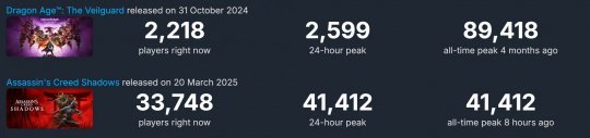 如果拿近期撲街的同樣正確大作《龍騰世紀:影障守護者》對比,《刺客信條:影》Steam在線峰值甚至不及前者,前者的Steam首發(fā)在線峰值接近9萬人(89418)。