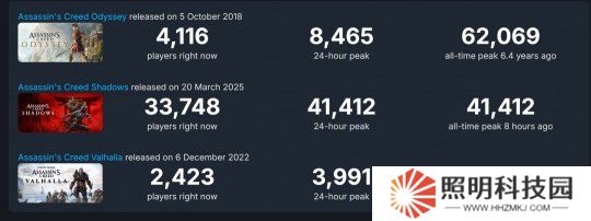 《刺客信條:影》Steam首發(fā)在線峰值41412人,不敵6年前的《刺客信條:奧德賽》,后者Steam在線峰值62069人。