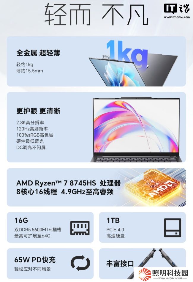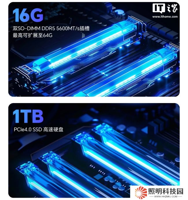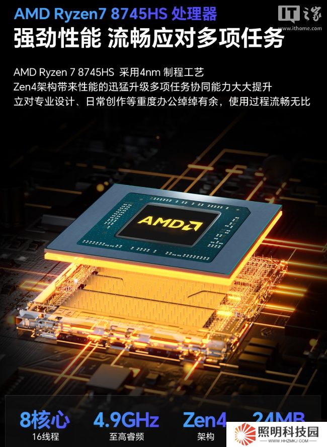 新款筆記本搭載 AMD 銳龍 R7-8745HS 處理器(4nm 工藝、8 核心 16 線程、至高睿頻 4.9GHz、Zen 4 架構、24MB 高速緩存),擁有雙 SO-DIMM DDR5 5600MT/s 插槽(至高可拓展至 64GB)、提供 1TB PCIe4.0 SSD 硬盤。