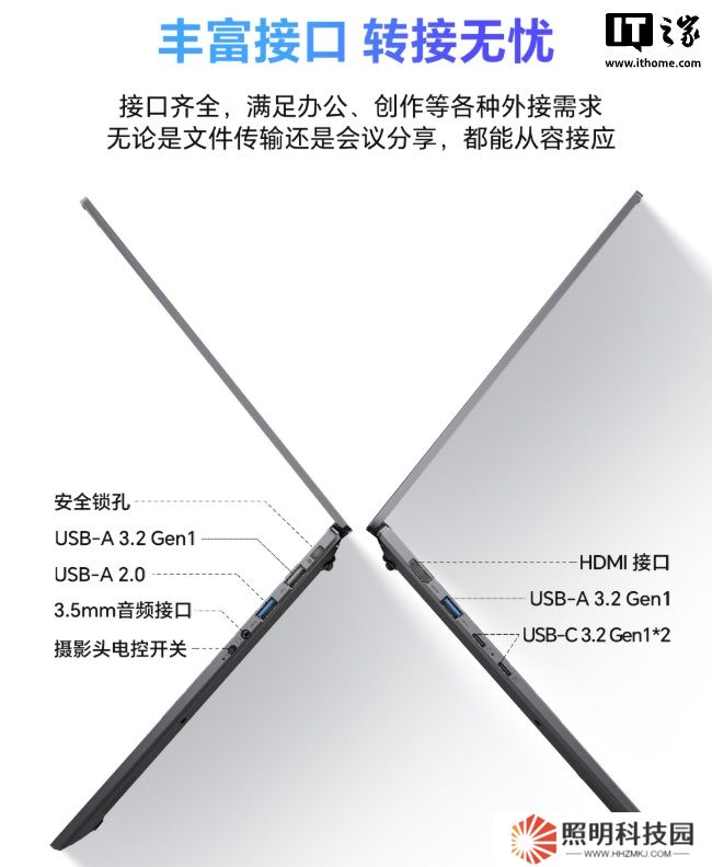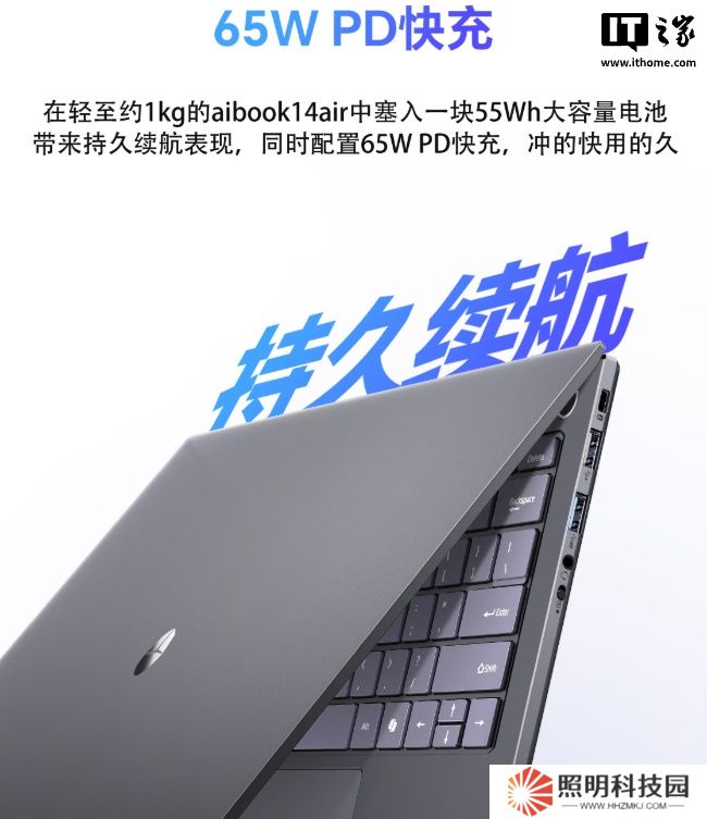 雷神 AiBook 14 Air 筆記本內置 55Wh 電池、支持 65W PD 快充。本站附筆記本機身接口如下: