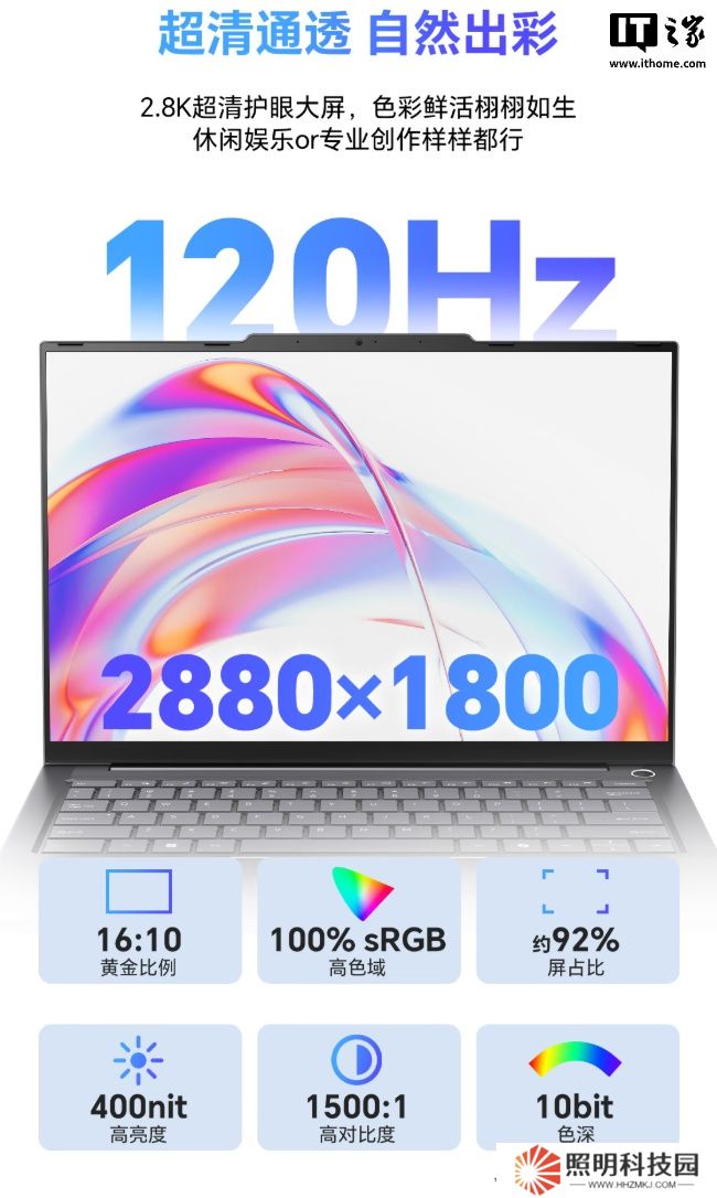 據介紹,雷神 AiBook 14 Air 筆記本采用全金屬設計,重量約 1kg、厚度約 15.5mm。新機配備 2.8K(分辨率 2880×1800)、120Hz 刷新率屏幕(覆蓋 100% sRGB 色域,支持硬件級低藍光、DC 調光)。