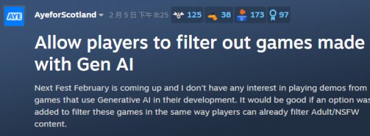 在全球最大的數字游戲分銷平臺Steam上,玩家們正在呼吁V社能夠上線AI作品篩選功能。大家明確表示,對AI生成游戲不感興趣,希望可以過濾到這些內容。