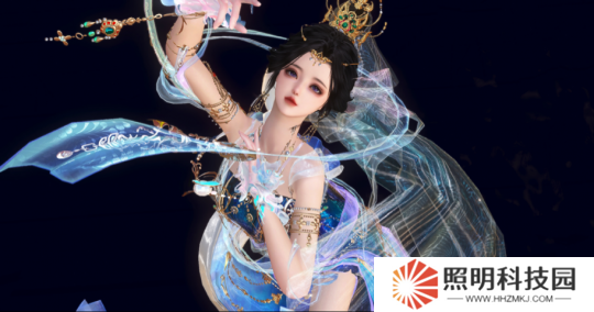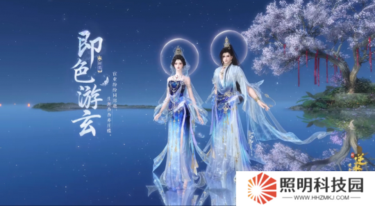 女款【即色游玄】似乎是將九天銀河化作衣裙,從深邃藍色漸變到淺白色的設計頗為別致,背后的皎潔玉盤、隨風搖曳的薄紗,以及華麗精致的飾品組合在一起,將神圣感打滿了全屏,以至于玩家發出了“自此不敢見觀音”的感嘆。