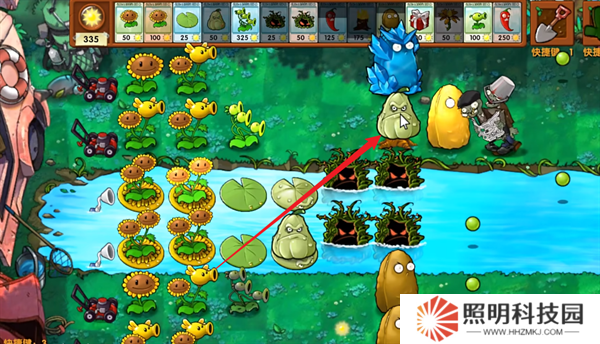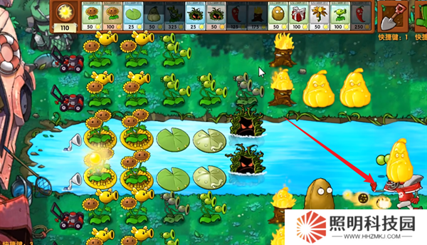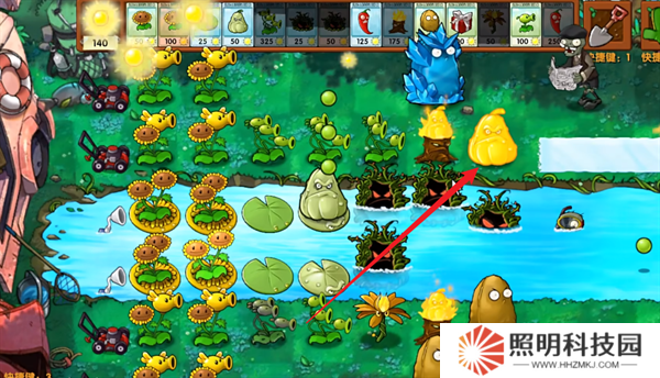 2、每點燃60個豌豆在前方生成一個火焰窩瓜。