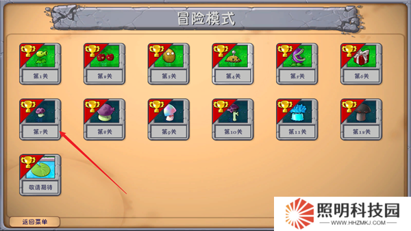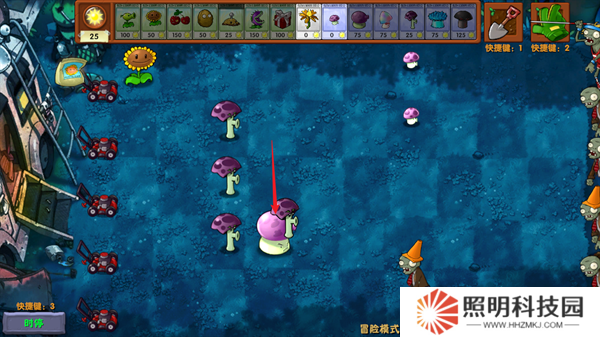 2、在冒險模式當中發點擊第七關,就能夠開始進入到黑夜模式當中進行游玩,其中加入了許多蘑菇類型的植物。