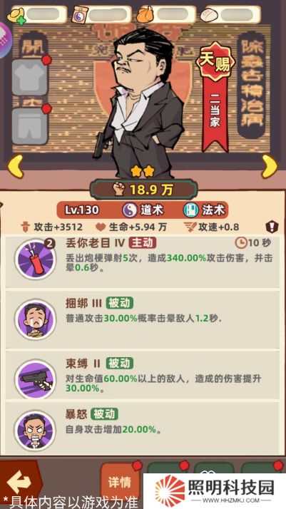 二當家的主動技能是丟出炮梗造成多次傷害,并且可以對攻擊的目標造成擊暈效果;二當家的被動技能是提升自己的攻擊力,使普通攻擊有概率進行擊暈,并且對生命值60%以上的目標造成額外的傷害;二當家可以瞬間給多個敵人帶來大量的法術傷害,當只有一個敵人時,二當家可以瞬間對這個敵人造成多次傷害,單體爆發能力很強;大俠可以根據需要,將二當家作為主要輸出角色進行培養,在競技場等需要瞬間爆發傷害的地方可以使用。