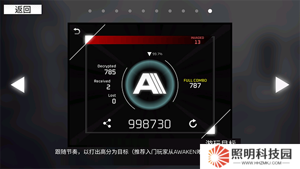 跟隨節(jié)奏,以打出高分為目標(推薦入門玩家從AWAKEN難度開始游玩)。