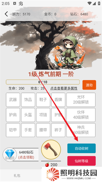 4、接下里點擊右下角的自動砍樹,以此來提升自己角色的實力。