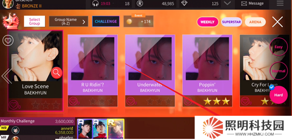 6、你就會進入到挑戰關卡的選擇界面,右側會存在著三種不同的難度選項。