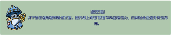 七、【國王菇】種下后在相鄰格召喚侍衛菇,提升場上所有“蘑菇”30%的攻擊力,自天時會睡覺并失去作用。