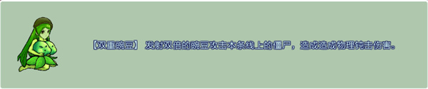 二、【雙重豌豆】發射雙倍的豌豆攻擊本條線上的僵尸,造成造成物理鈍擊傷害。