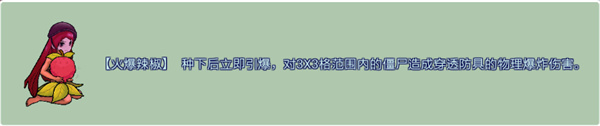 四、【火爆辣椒】 種下后立即引爆,對3X3格范圍內的僵尸造成穿透防具的物理爆炸傷害。
