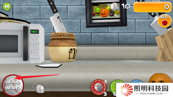 4、玩家們擊打水果的底部使其飛躍出去。