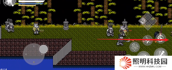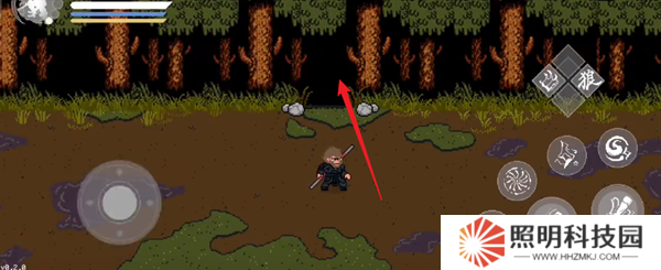 4、來到第四塊地圖之后,將其中的妖怪擊殺,然后往上方兩塊石頭中間的樹里面進行移動。
