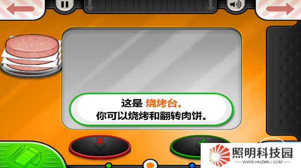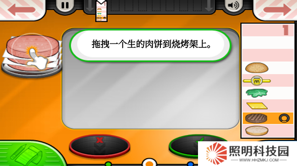 5、然后回到后廚進(jìn)行漢堡肉餅的制作,你需要將一個(gè)生肉餅拖拽到燒烤架上,到了橙色就翻面。