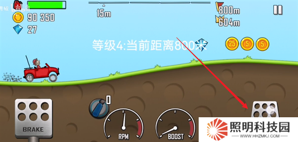 2、在關卡當中點擊右下角的油門就能夠讓自己的賽車前進。