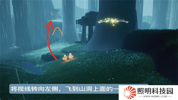 2、然后我們視線往左轉,飛向山洞上的樹屋前面。最后我們進入秘密花園樹洞,在旁邊即可找到膽小鬼先祖了。