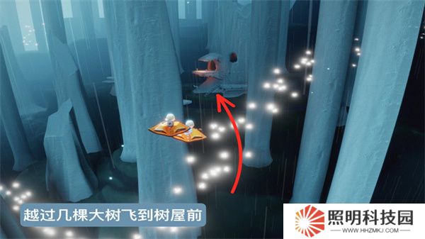 2、接著玩家們控制角色往左側的樹屋飛去,繞到樹屋后面找先祖。