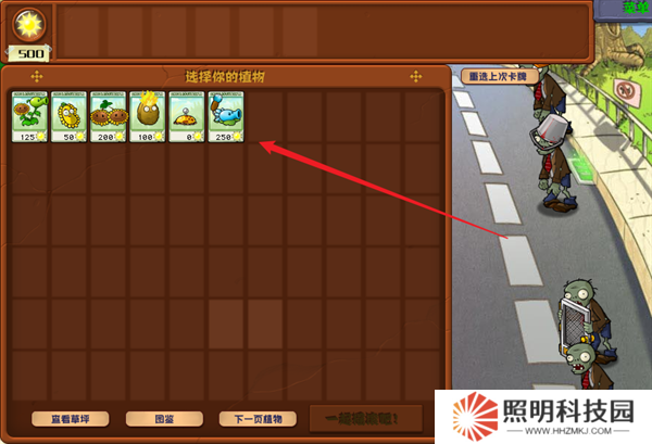 6、你可以在右側看到這一個關卡內部需要進行作戰的僵尸,并從左邊選擇自己出戰的植物卡牌。