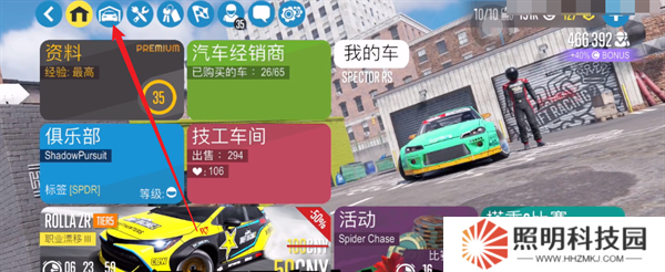 1、玩家們進入游戲之后,首先需要點擊主界面上方的第二個按鈕,進入到自己的車庫當中。