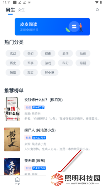 皮皮閱讀app去廣告版使用教程:1、進入小說以后,點擊書庫就可以在線閱讀了
