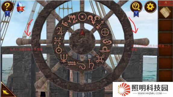 7、現(xiàn)在用舵盤上的指針把雷達(dá)上對應(yīng)的4個圖案按照順序逐個對應(yīng),這里千萬注意,大部分人會卡在這里,指向第一個圖案后,一定要向相反的方向轉(zhuǎn)動,和保險箱的原理一樣。