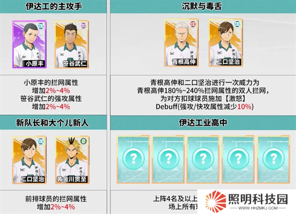 伊達工業高中是一個注重與攔網的隊伍,而攔網說白了就是陣容的防御能力,隊伍的所以成員均可以提升攔網的屬性值,在攔網成功的情況下,還可以降低對方的輸出,在PVP中有著不錯的表現。