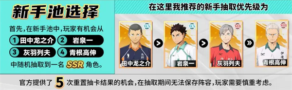 首先在新手池中,玩家有機會從田中龍之介、巖泉一、灰羽列夫、青根高伸中隨機抽取到一名SSR角色。