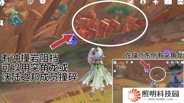 途中會遇到沖撞巖阻擋,可以使用基尼奇的技能、魂附匿葉龍,或使用瓦雷莎/伊安珊直接撞碎。清理沖撞巖后,還能獲得一個普通寶箱!