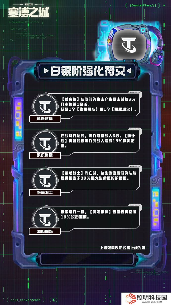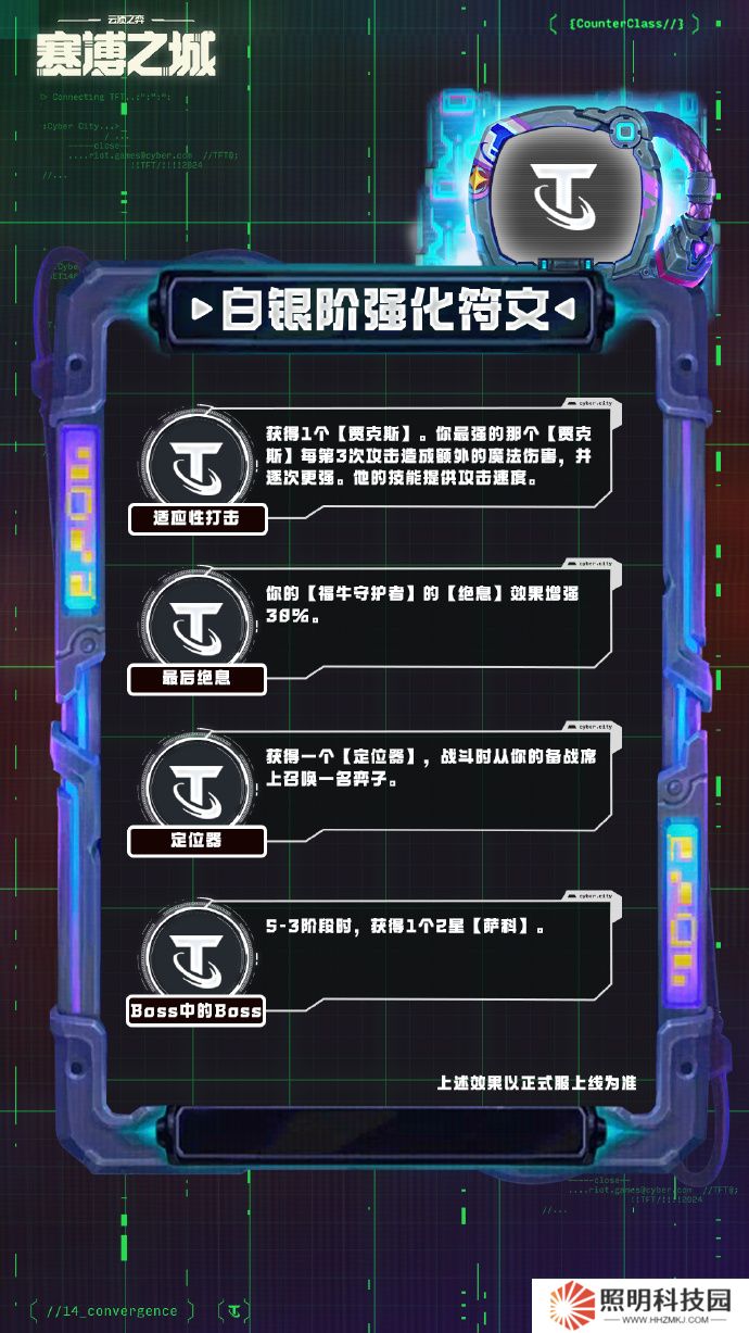 云頂之弈即將迎來S14賽季賽博之城,在這個賽季將會上線全新的白銀階強化符文,那么大家知道白銀階強化符文究竟是怎么樣的呢?下面快跟隨本站小編為大家帶來的云頂之弈S14白銀階強化符文吧。