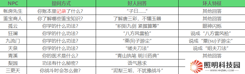 5、狂瀾:問他帶了什么,說“槍是為了練習門派功法”的是好人,沒提門派功法的是壞人。