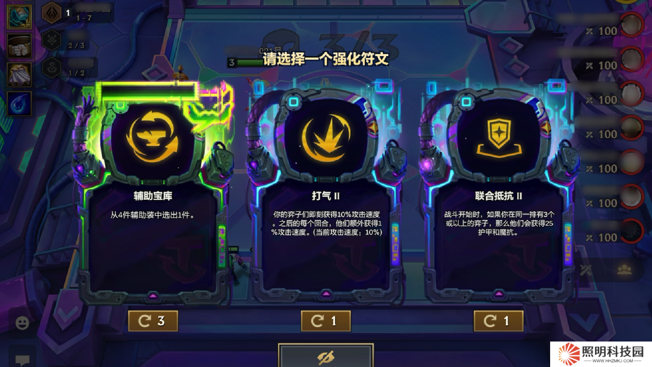 主題符文格:最左側的強化符文格重隨次數增加,并且只會包含特定類別的符文,如裝備類、經濟類(金幣、經驗值、重隨)、混亂類(混沌召喚等隨機效果符文)、羈絆類、黑市類(往屆符文回歸)、構筑類(陣容構筑類符文,如終身黃銅、卓爾不群、小伙伴等)、站位類(影響棋盤站位的符文)和戰斗類(強化生命值、攻擊力/法強等戰斗力的符文)。